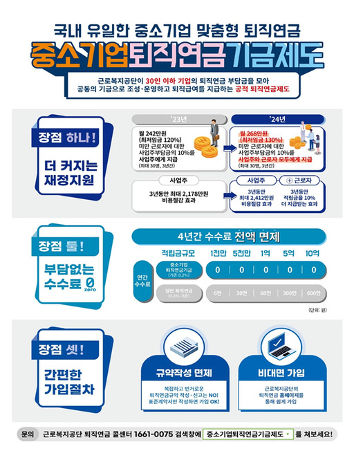 - 교육/컨설팅 무상: 제도 설계, 규약/취업규칙 개정, 상품선택, 근로자 교육을 무상 제공하는 프로그램이 다수 운영됩니다.